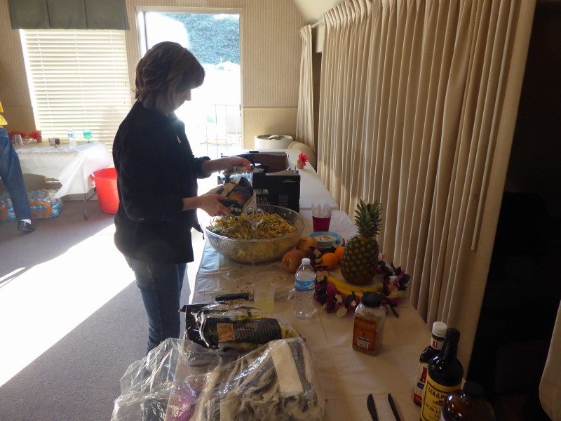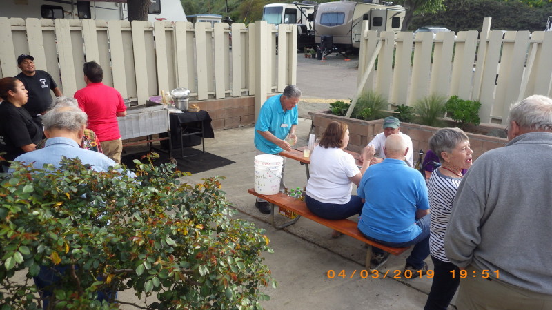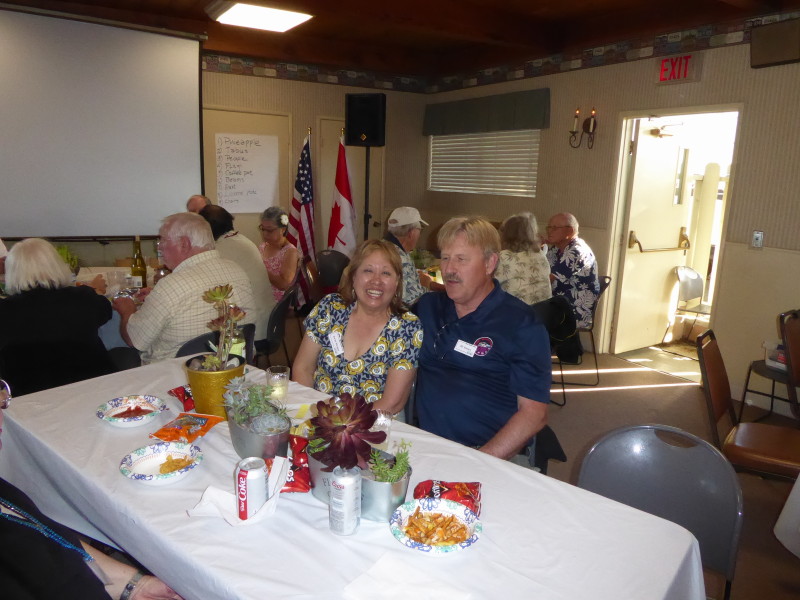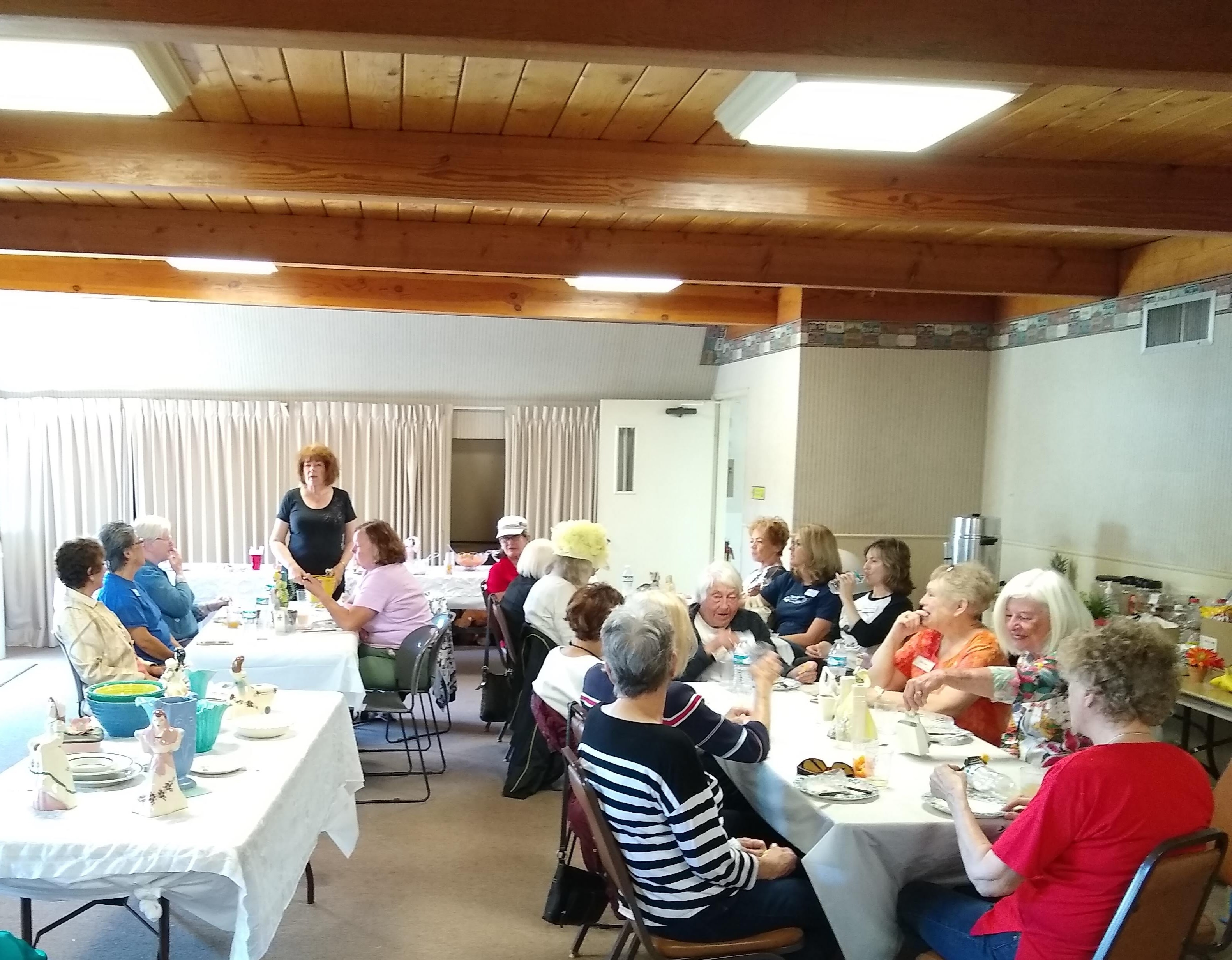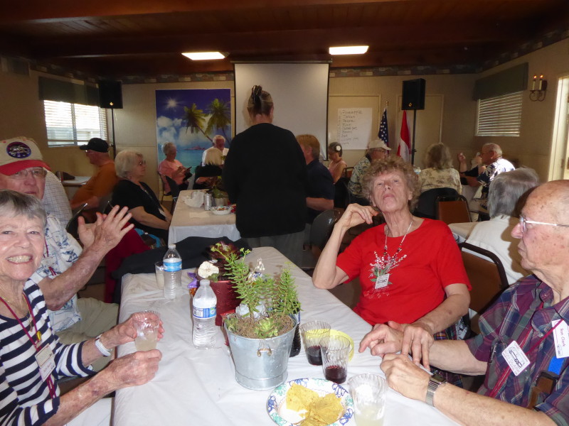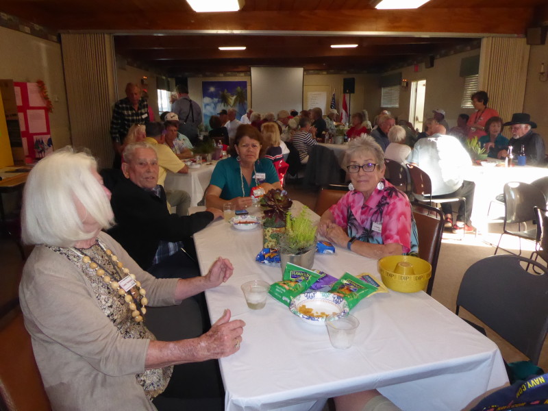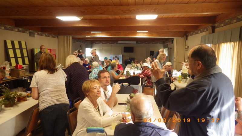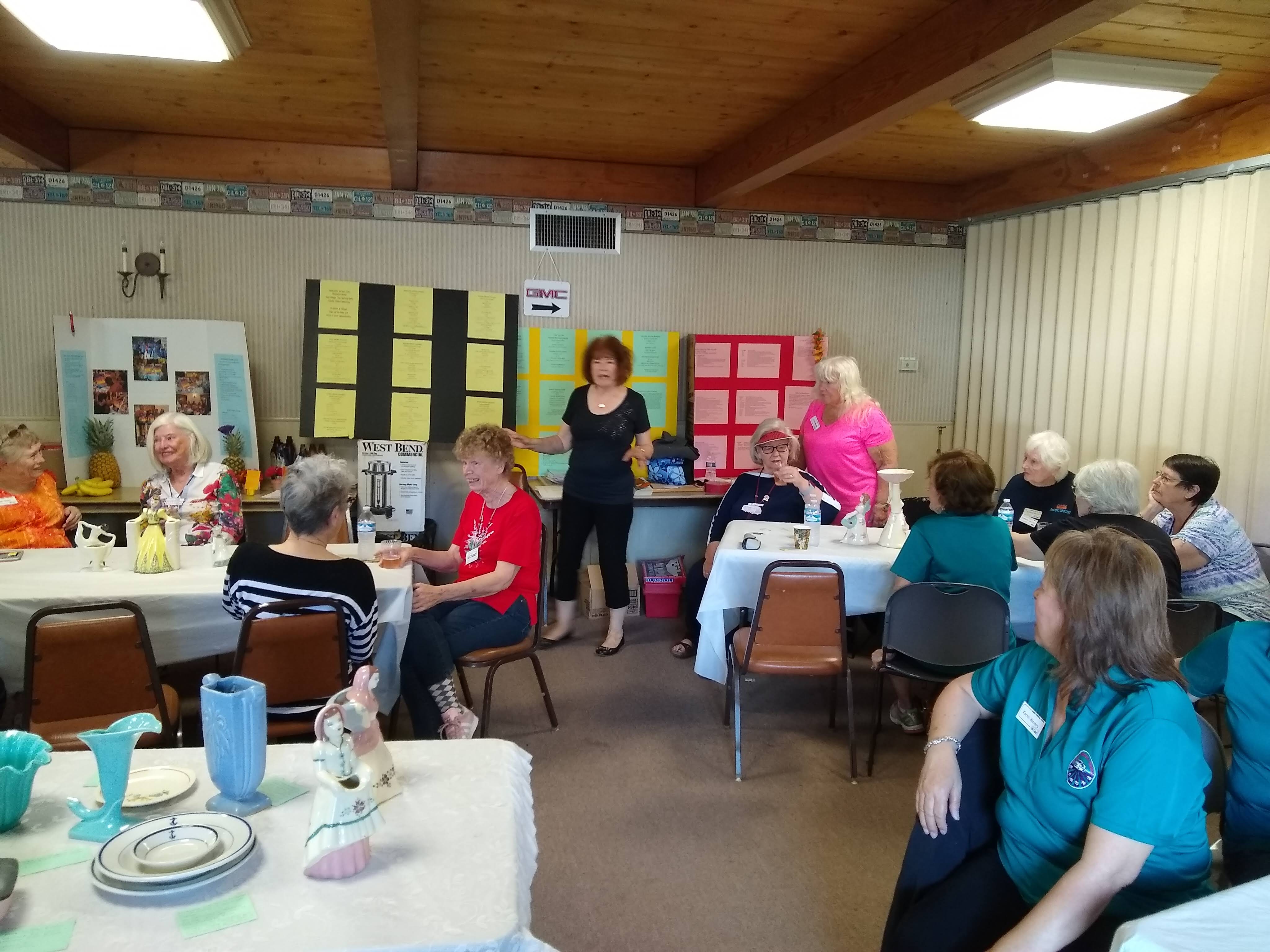 Sunday, April 7th we had some church, some (GM) history, and some more Hawaiian food. The ladies had an Easter Brunch with a presentation of California Pottery. Fran Fimbres donated 3 of her California Girls to raffle.